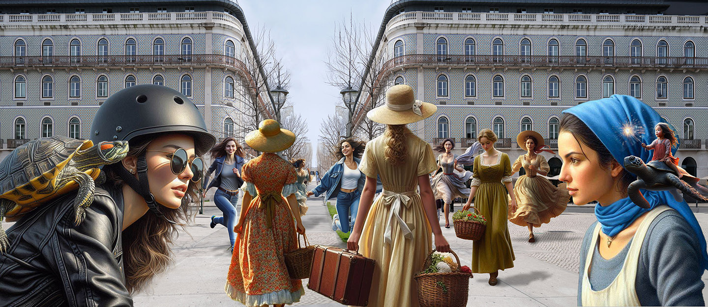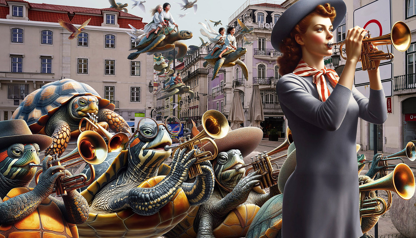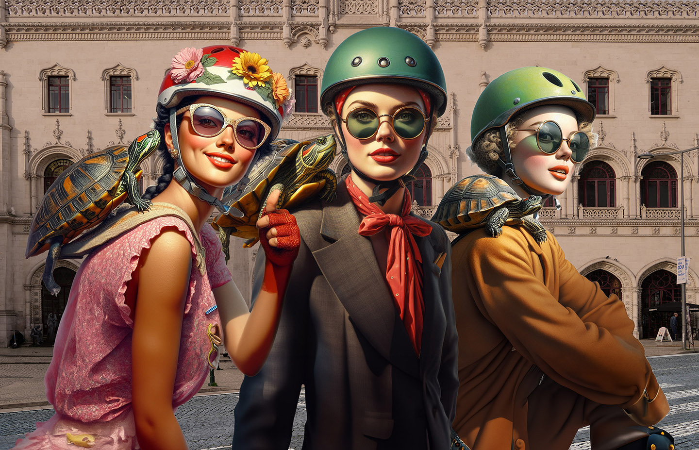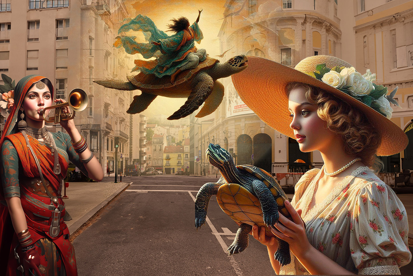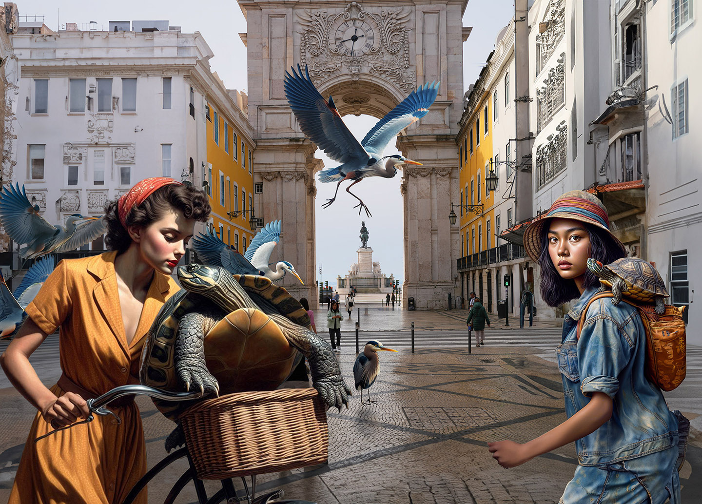 Sisters of the Magic Turtle - episode 9 : Lisbon 25" X 36" Photo/Computer Illustration - BING AI Image Generator - Inkjet Print